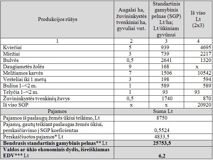 ***Bendrąjį standartinį gamybinį pelną (25753,5 Lt) padalijus iš ekonominio dydžio vieneto (4143 Lt) apskaičiuojamas valdos ar ūkio ekonominis dydis, išreiškiamas EDV.